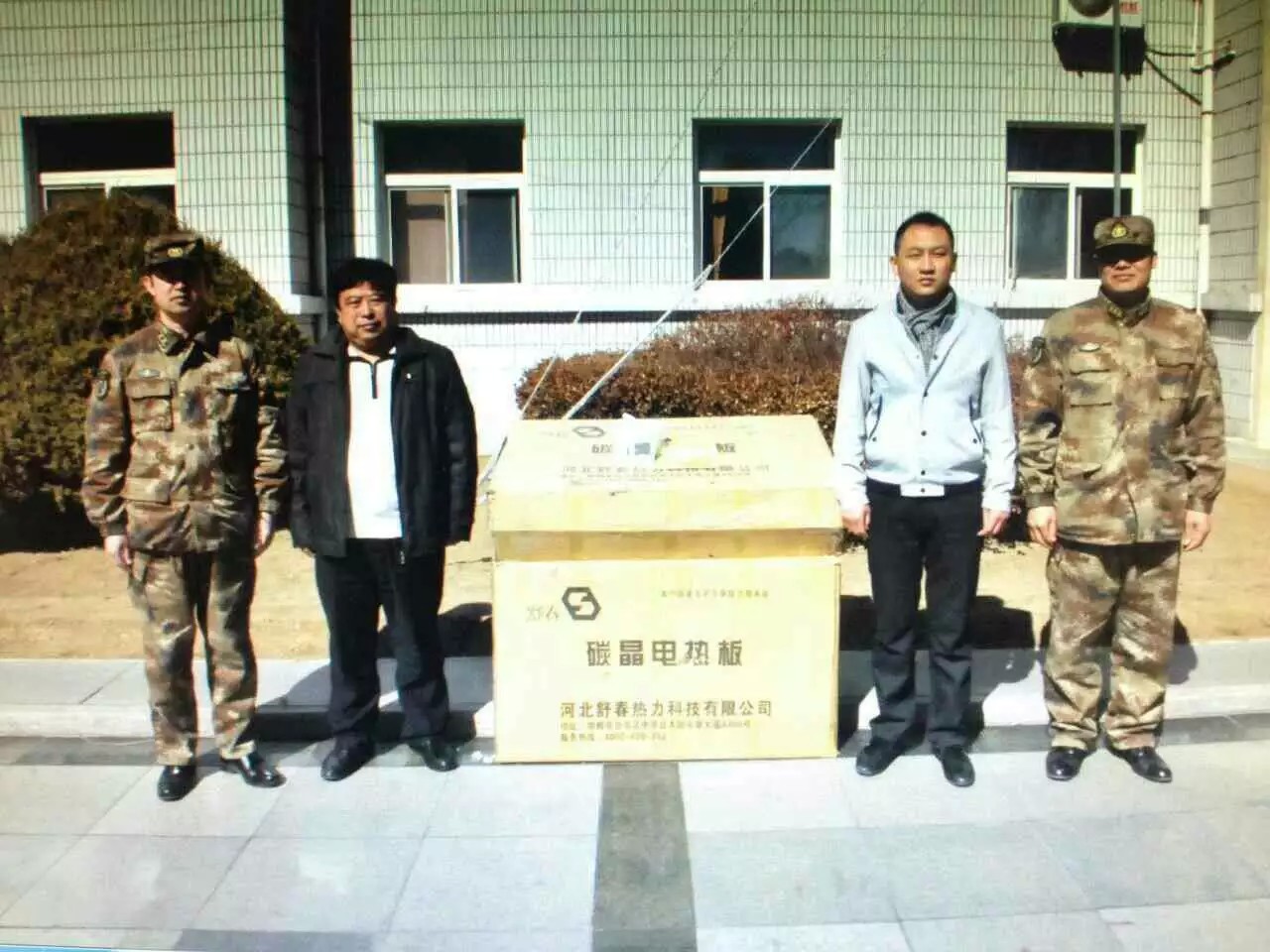 舒春走進(jìn)軍營(yíng) 2016年3月10日河北舒春公司走進(jìn)承德市平泉縣66435部隊(duì),為哨所免費(fèi)安裝了一萬(wàn)多元的碳晶電熱板,給軍營(yíng)送去了溫暖。