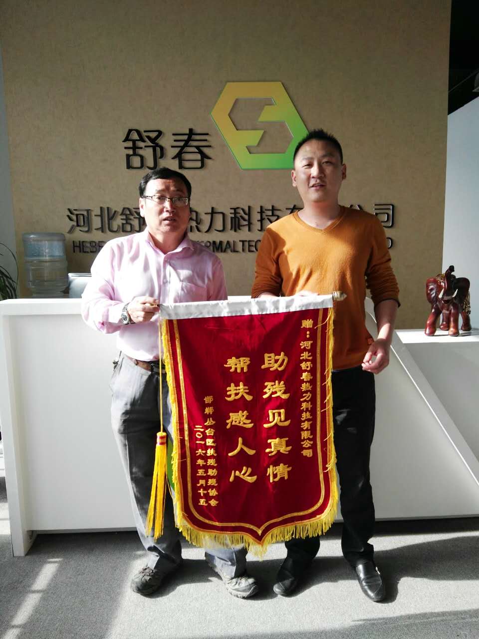 舒春送溫暖 助殘在行動 為深入貫徹黨的十八大和十八屆三中、四中、五中全會精神,認(rèn)真落實(shí)省市關(guān)于加快推進(jìn)小康社會進(jìn)程的要求,推進(jìn)“全國慈善城市”“全國文明城市”創(chuàng)建進(jìn)程,在全社會弘揚(yáng)人道主義精神,倡導(dǎo)扶殘助殘的社會風(fēng)尚,推進(jìn)我區(qū)殘疾人事業(yè)全面發(fā)展,河北舒春熱力科技有限公司董事長馬建崗攜邯鄲市綠色環(huán)保聯(lián)合會副會長電供暖委員會秘書長焦琳一起走進(jìn)叢臺區(qū)肢殘協(xié)會。